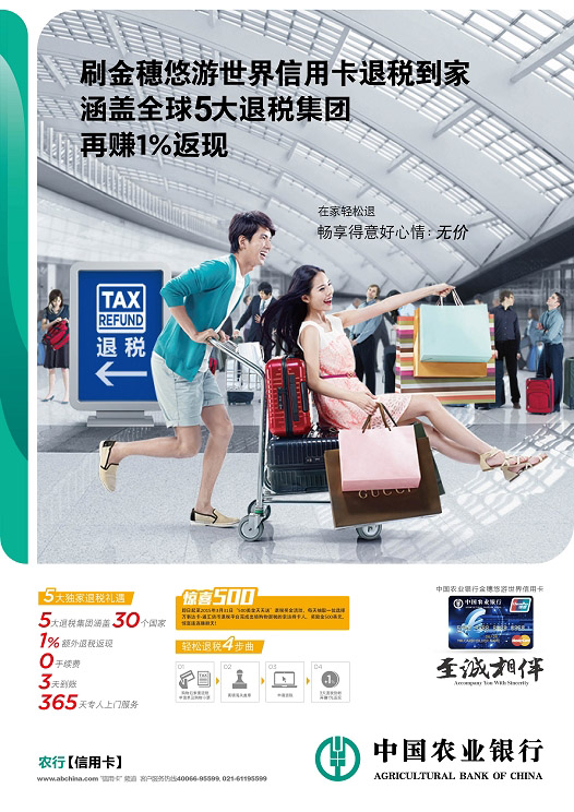 金穗悠游世界卡(万事达品牌卡)持卡人通过万事达退税平台网站 通汇货币线上退税平台办理退税业务,并可享受“0”手续费,3个工作日到账,且可额外获赠相当于本次退税款1%的返现,和退税款额一起打入金穗悠游世界信用卡账户。