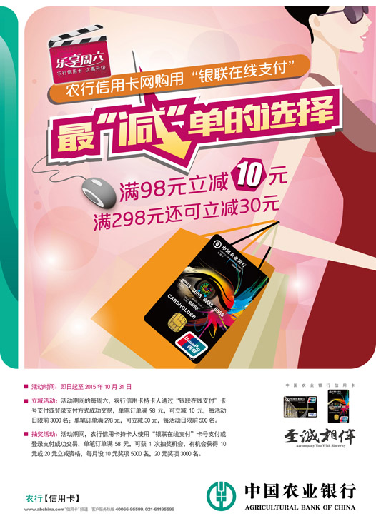 活动期间的每周六早上10:00开始,农行信用卡持卡人通过“银联在线支付”卡号支付或登录支付,成功交易,可享立减优惠。