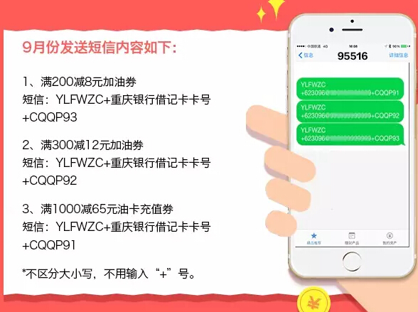 2015年9月3日-2015年12月31日,重庆地区,重庆银行借记卡客户每月发送指定短信至95516抢购壳牌石油专属优惠券,客户持短信中发送的借记卡至重庆壳牌石油指定加油站通过银联钱包渠道刷卡消费即可尊享超值立减优惠。