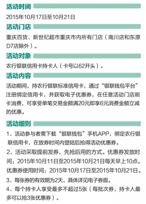 2015年10月17日至10月21日,参加“重阳感恩季主题营销活动”,在重百/新世纪超市重庆市内所有门店(南川店和东原D7店除外)刷卡消费,单笔交易金额满20元即享6元消费金额立减的优惠。