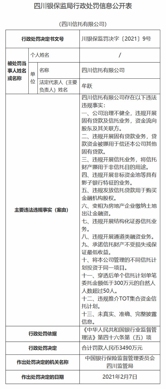 3月12日消息,四川银保监局公布的行政处罚信息公开表显示,四川信托有限公司因涉及公司治理不健全,违规开展固有贷款及信托业务,资金流向股东及其关联方等十三项违法违规行为,被处罚款3490万元。