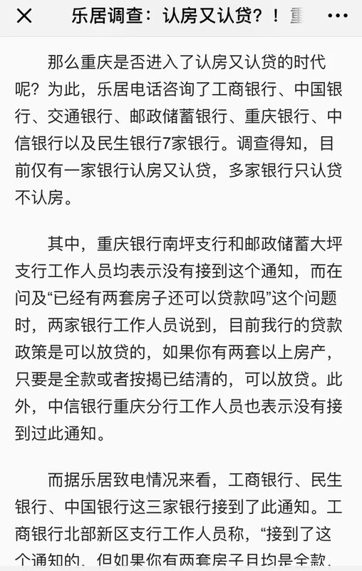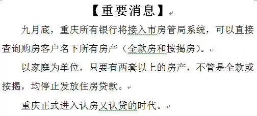 重庆有两套房的家庭有多少?不从面积上讲,重庆有两套的家庭估计能超过半数,之前大量小户型商品房,加上安置房、经适房、集资房,继承下来的老房子。之前三无不贷,影响的可能是10%,这次,如果不加以区分,有两套不贷,潜在需求下降50%以上。认房认贷不只是大杀器,简直是核武器了。