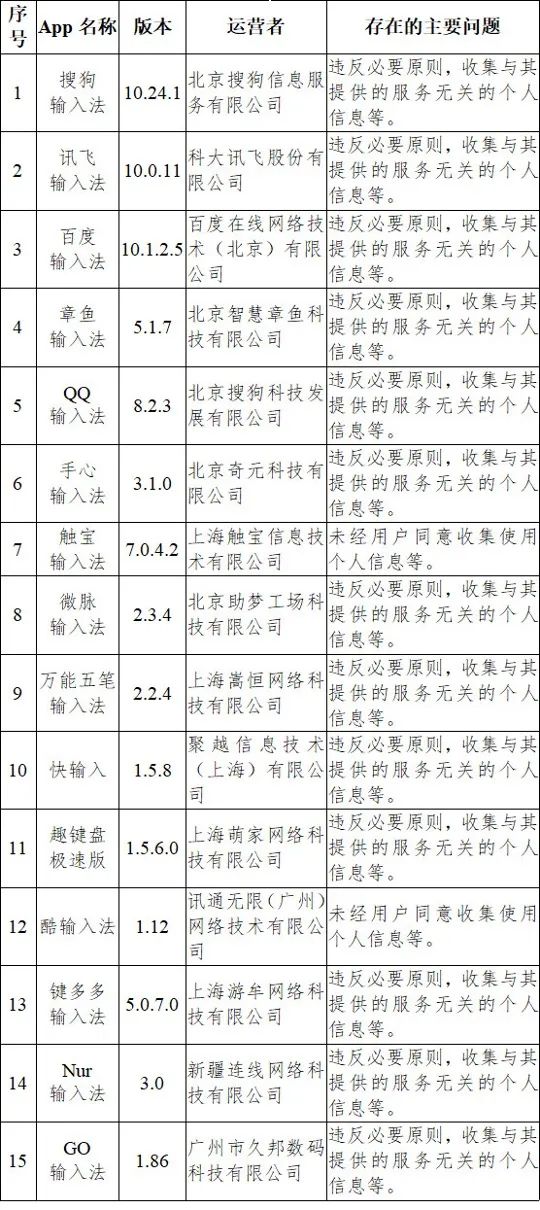 据此前消息,国家网信办官网发布33款App违法违规收集使用个人信息情况的通报,被通报的App主要涉及输入法类、地图导航类、即时通信类,在被通报的输入法类App里,搜狗、讯飞、QQ输入法均榜上有名。
