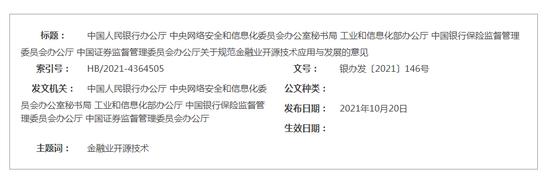 人民银行办公厅 中央网信办秘书局 工业和信息化部办公厅 银保监会办公厅 证监会办公厅联合发布《关于规范金融业开源技术应用与发展的意见》