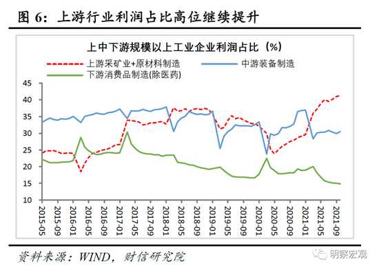 二、分行业看,上游利润占比再创新高,中下游盈利加快走弱。如受益于大宗商品价格攀升,三季度采矿业、原材料制造业利润分别同比增长2.04倍和42.5%,增速远超全部工业,两者1-9月份利润占全部工业的比重较1-8月份提高0.2个百分点至41.2%,亦再创新高。相比之下,受成本抬升和内需求走弱的拖累,1-9月份中游装备制造业和下游消费品制造业利润两年平均增速,分别较1-8月份回落1.1和1个百分点,均边际继续放缓。