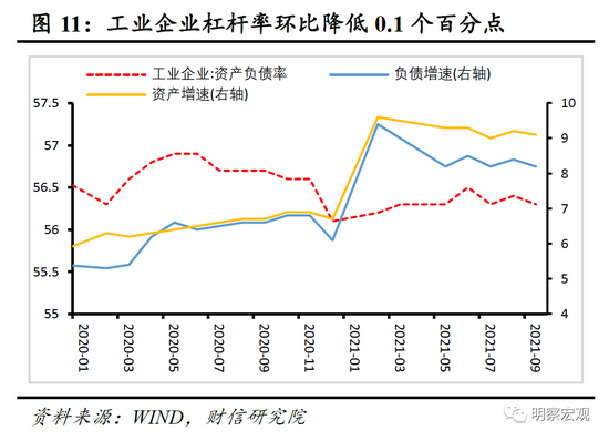 2021年9月末,工业企业资产负债率为56.3%,较去年同期低0.4个百分点,较上月也降低0.1个百分点(见图11),企业继续小幅去杠杆。
