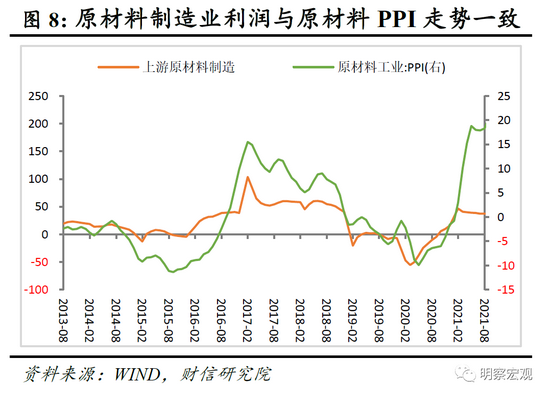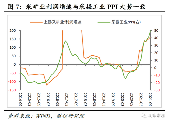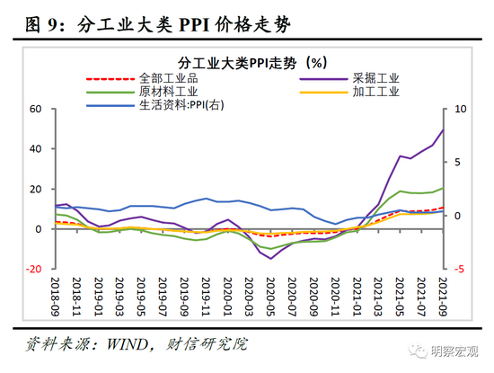 三是从利润分布看,原材料涨价和终端需求疲弱共致上游利润占比再创新高。如1-9月上游采矿业和原材料制造业利润占全部工业的比重高达41.2%,较1-8月份再度提高0.2个百分点;同期除医药制造外的下游消费品制造业利润占比继续刷新历史新低,降至14.8%(见图6)。具体看企业盈利分布不平衡的原因,或仍主要与终端需求偏弱、上游涨价向下游传导有限相关。如历史经验显示,采矿业、原材料制造业、装备制造业和消费品制造业利润走势,分别与采掘工业、原材料工业、加工工业和生活资料工业PPI价格走势高度相关(见图7-8)。9月份采掘工业和原材料工业PPI增速继续攀升,且高出全部工业PPI增速38.7和9.7个百分点(见图9),导致工业利润向上游集中;同期生活资料PPI维持低位,低于全部工业超过10个百分点,拖累下游消费品制造业利润占比持续回落。