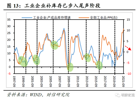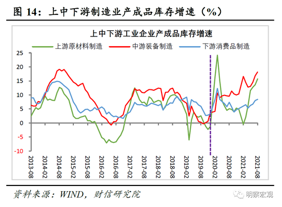 展望未来,预计本轮工业补库存周期大概率步入尾声:一是随着主要经济体PMI高位持续回落,加上PPI继续大幅抬升空间有限,企业补库动力或仍不足。二是自2019年末以来工业企业补库存周期已持续7个季度有余,且上、中、下游制造业库存增速均已处于历史高位区间,后续上行空间或有限(见图14);三是随着去年四季度产成品库存增速基数回落,不排除未来个别月份工业库存增速或有所反弹,但不改本轮补库周期步入尾声大趋势。