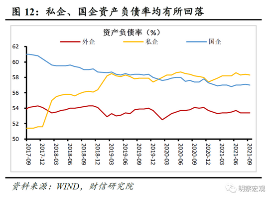 分企业类型看,国企和私企资产负债率环比均有所回落,如9月末国企、私企和外企资产负债率分别为57%、58.4%和53.4%,分别较上月降低0.1个百分点、降低0.1百分点和保持不变(见图12)。