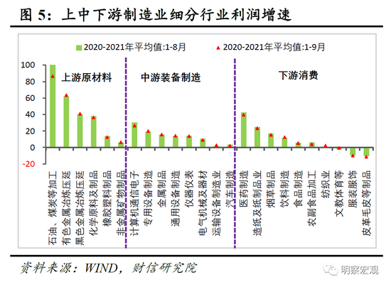 二是从制造业内部看,上游盈利保持较快增长,中下游利润增速均明显走弱。其一,受益于大宗商品价格攀升和出口持续强劲,三季度原材料制造业利润同比增长42.5%,增速高出同期全部工业28个百分点,且其中石油煤炭等加工业、有色金属冶炼压延业两年平均增速均超过60%(见图5)。其二,受原材料、人工等成本上升和国内需求端走弱拖累,1-9月份中游装备制造业两年平均增速较1-8月降低1.1个百分点至14%,连续7个月回落,较年内高点降幅已超过45个百分点(见图4),其中计算机通信等设备、气机械及器材和汽车制造是中游装备制造业环比走弱的主要拖累项(见图5)。其三,同样受需求走弱和成本上升拖累,1-9月份消费品制造业利润两年平均增速较1-8月份降低1个百分点至15.5%,且其中医药制造、农副食品加工、烟草制品等行业两年平均增速均放缓1.5个百分点以上(见图5)。