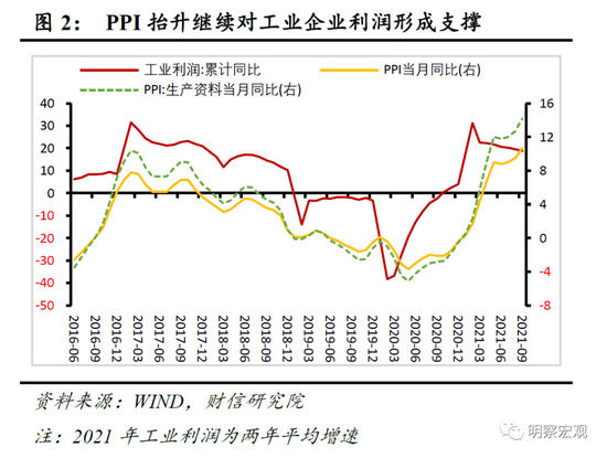 二是价格方面,受疫情反弹、用工紧张和环保限产拖累供给,同时国内外经济修复支撑需求的共同影响,全球主要大宗商品价格高位继续大幅攀升,9月份工业生产者出厂价格指数(PPI)和生产资料价格指数分别增长10.7%、14.2%,较8月份分别提高1.2和1.5个百分点,对工业利润继续形成重要支撑(见图2)。