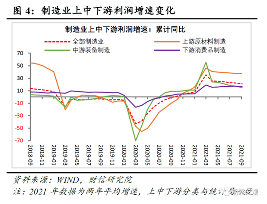 三、预计四季度工业企业利润增速或持续温和放缓。一是中下游企业成本压力加大,加之上游高耗能行业面临的供给约束仍强,四季度工业生产、房地产投资放缓压力增加,将共同导致利润增速边际放缓。二是本轮全球经济复苏周期被拉长和今年大概率遭遇“冷冬”将推升能源需求,加上大宗商品供给恢复偏慢、全球流动性依旧充沛,预计四季度PPI中枢水平还将走高、维持在10%以上,继续对工业利润形成一定支撑,工业利润下降速度或仍偏温和。
