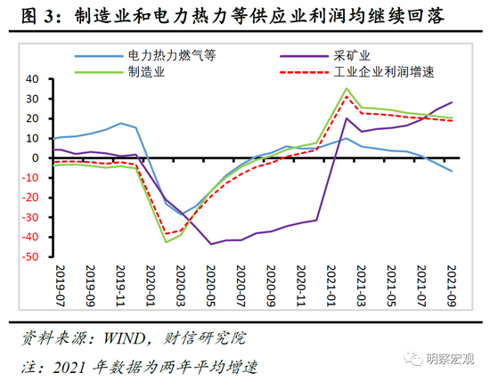 一是从三大门类看,采矿业利润再改善,制造业和电力热力等供应业利润均放缓。如1-9月份采矿业、制造业和电力热力燃气及水的生产供应业利润两年平均增速,分别较1-8月份提高3.6、降低0.9和降低3.9个百分点,后者连续2个月负增长(见图3)。