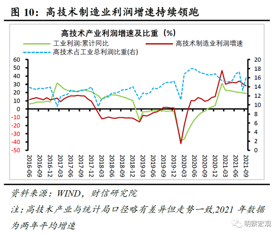 四是高技术制造业利润持续领跑。三季度,高技术制造业利润同比增长33.6%,增速高于规模以上工业平均水平19.3个百分点;根据我们的统计,1-9月份高技术制造业利润占工业总利润的比重达到16%左右,较2019年同期提高1.3个百分点(见图10),经济中新动能的贡献日益增强。