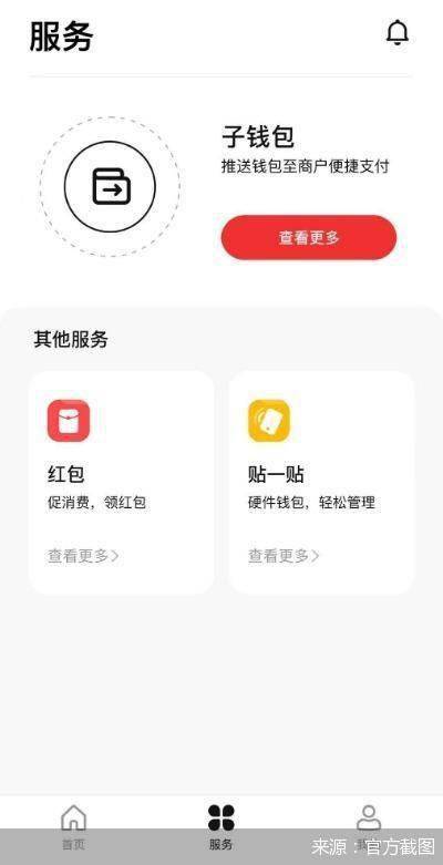 具体来看,数字人民币(试点版)App较此前版本有了功能和分区上的升级,其中在分区上,将界面简化成“首页、服务、我的”三大板块,首页显示所有已开通钱包和相关功能,服务包含子钱包、红包、硬件钱包管理等功能,“我的”则管理新开钱包、账号安全、设置相关的功能。
