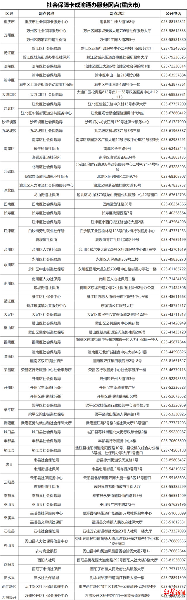 社会保障卡成渝通办服务网点(重庆市)