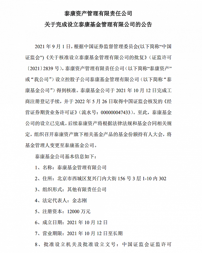 5月28日,泰康资产发布公告,控股子公司泰康基金管理有限公司(简称“泰康基金”)于5月26日取得中国证监会核发的《经营证券期货业务许可证》。至此,泰康基金的设立已完成。