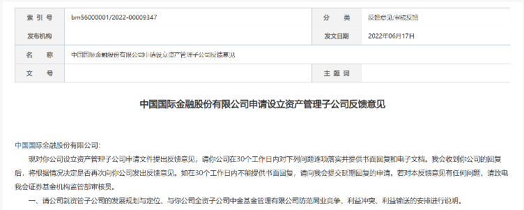 对于中金资管子公司的设立申请,证监会一共反馈了六条意见。