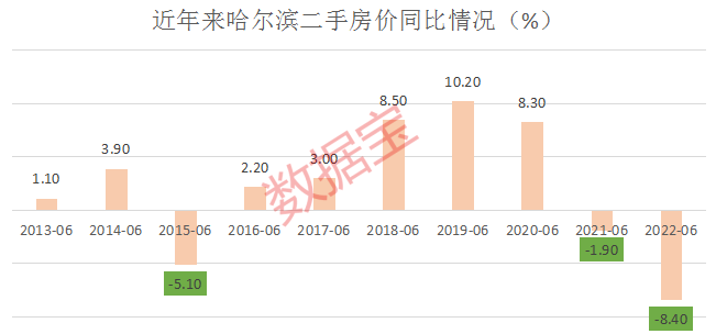 隶属东三省的8个大中城市今年6月份二手房价同比全部下跌,哈尔滨、长春两大省会二手房价均退回到3年前。具体而言,哈尔滨今年6月二手房价同比下跌8.4%,去年6月同比下跌1.9%,2020年同比上涨8.3%。据此计算,哈尔滨最新二手房价较3年前同期下跌2.68%。同样的计算方式,长春最新二手房价相比3年前同期下跌1.13%。