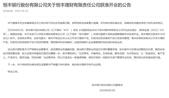 8月3日,恒丰银行官网发布公告称,已于当日收到《中国银保监会关于恒丰理财有限责任公司开业的批复》。批复显示,该行全资子公司恒丰理财获准开业。